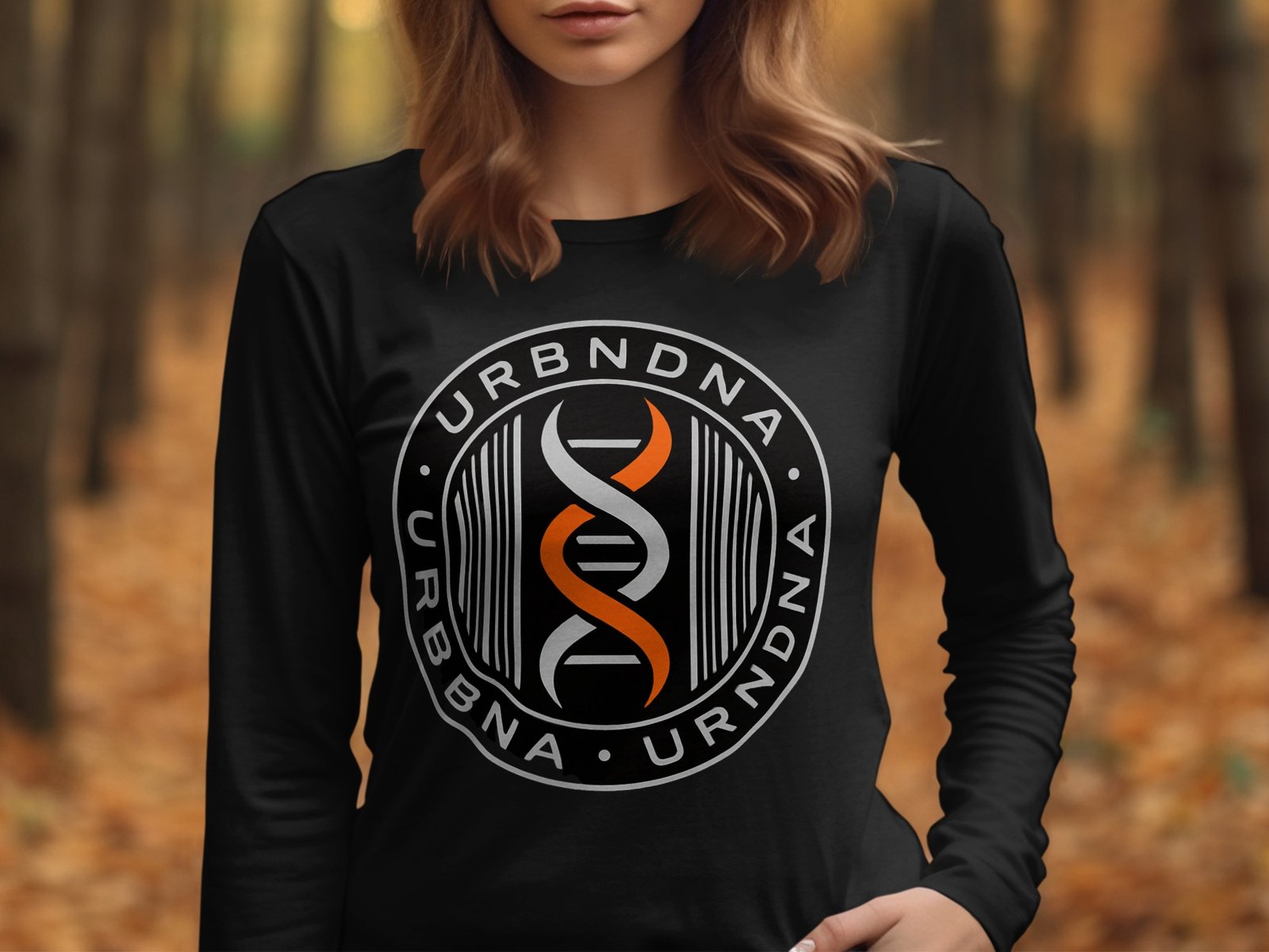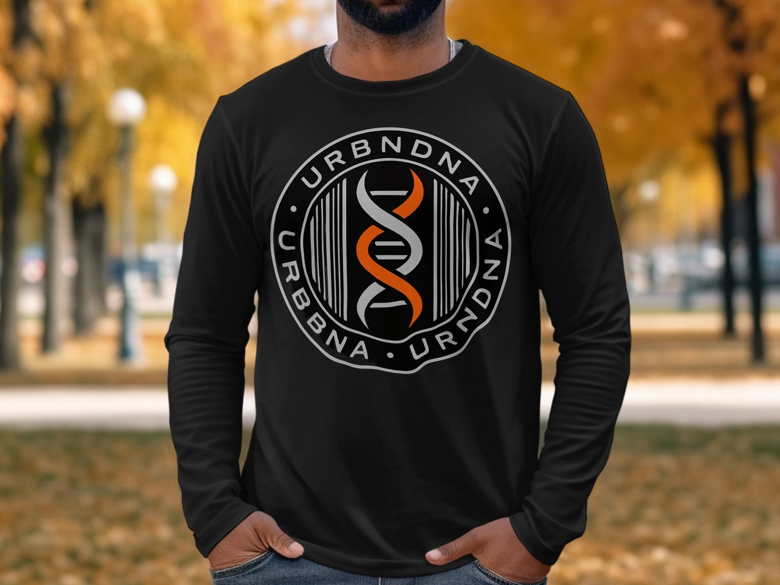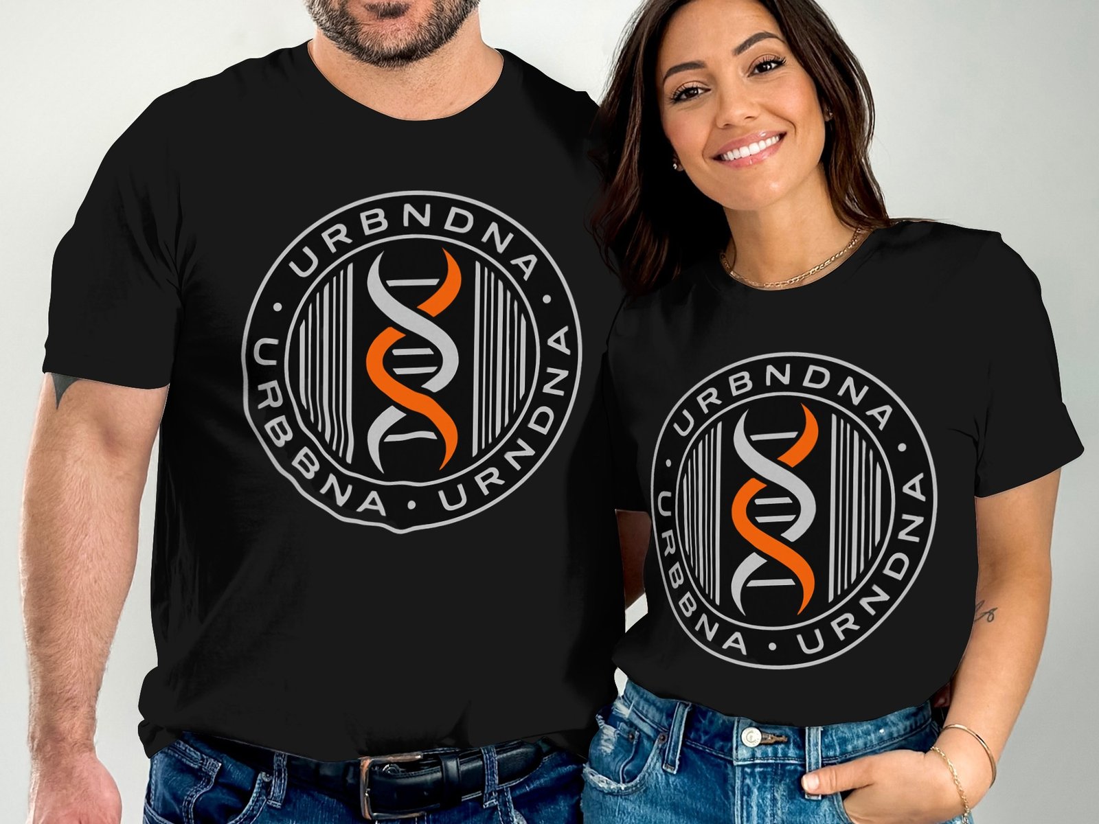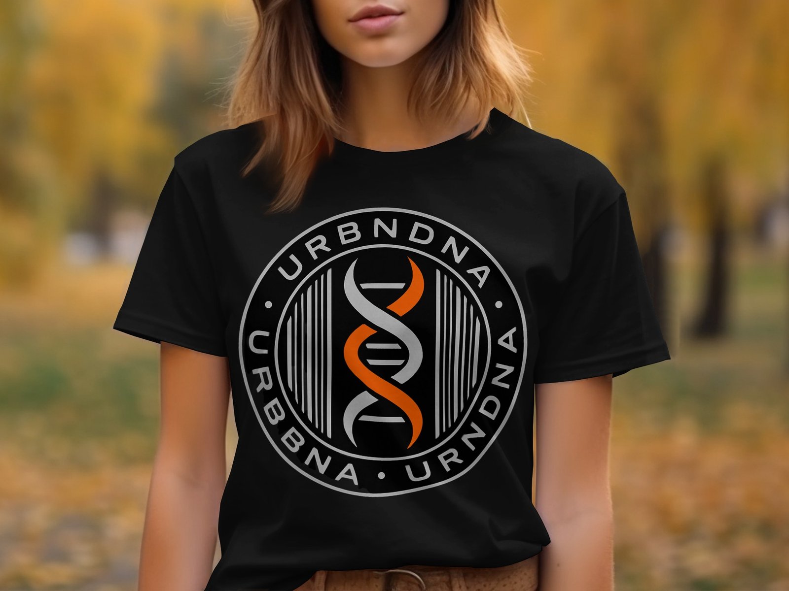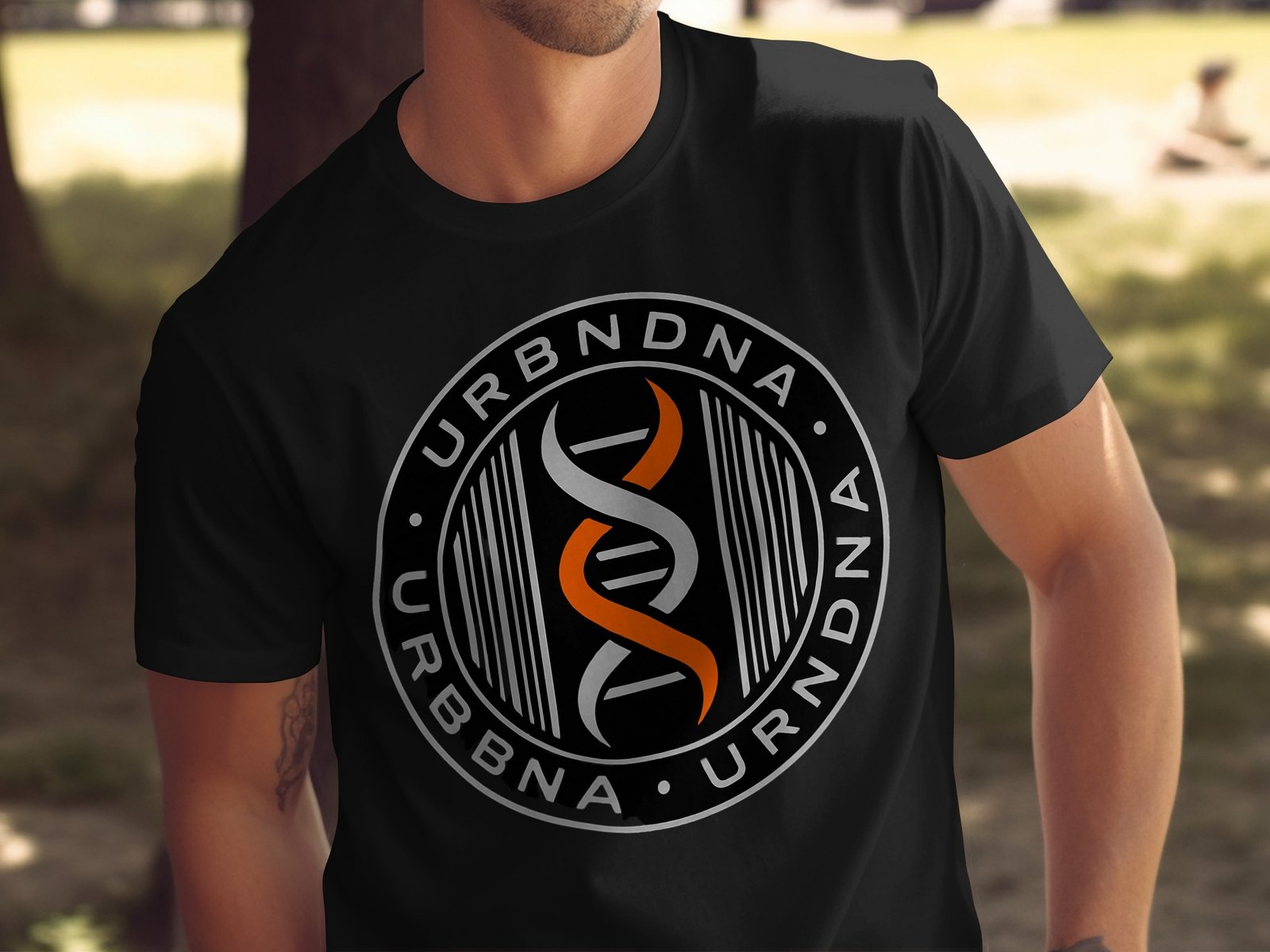 Embrace the urban DNA with this graphic tee. Featuring the URBNDNA logo in a bold circular design with a double helix in orange white against a black background. Show your unique style!